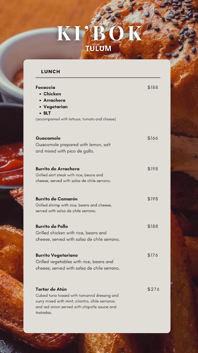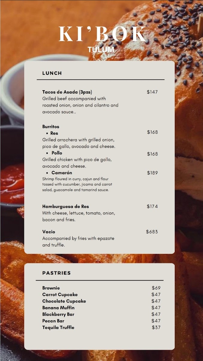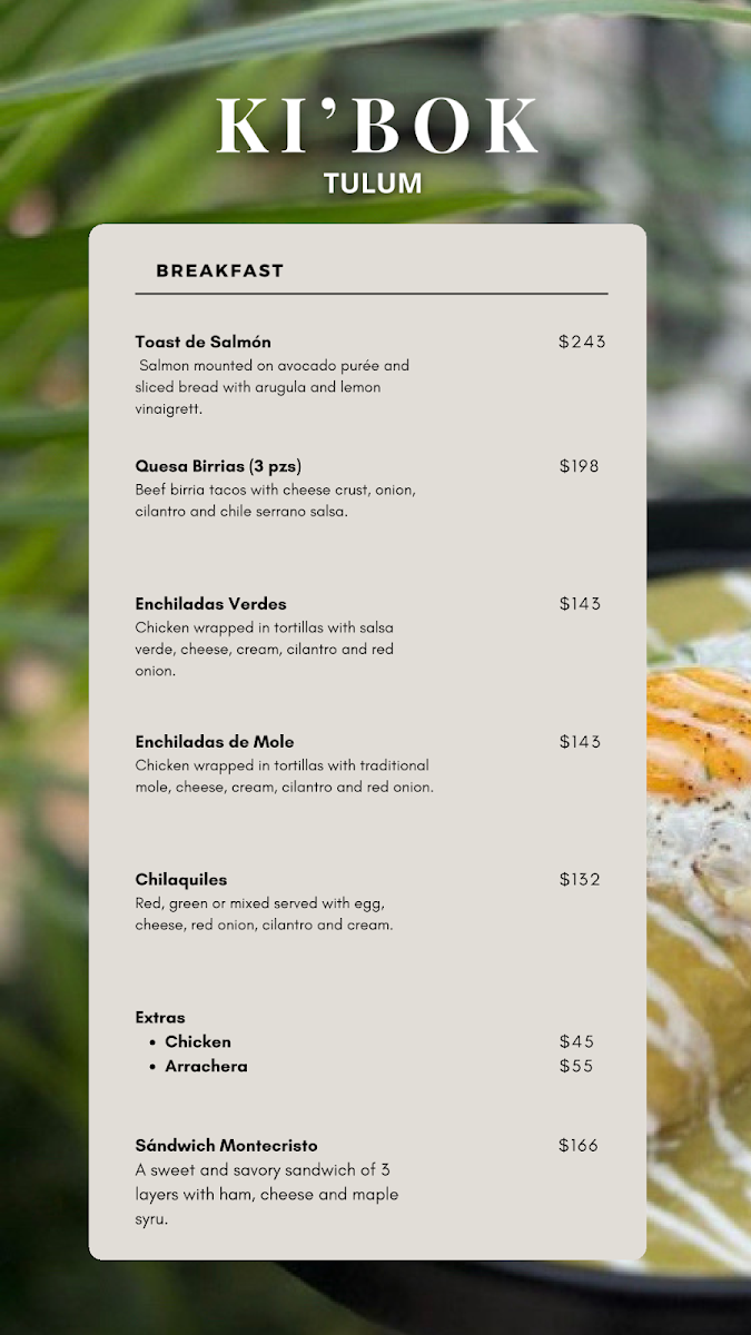 The menu at Ki'bok Coffee Tulum offers a variety of choices suited for breakfast, brunch, and casual dining throughout the day. Visitors can find a selection of coffee beverages alongside a range of food items that include traditional Mexican dishes as well as classic breakfast and brunch options.